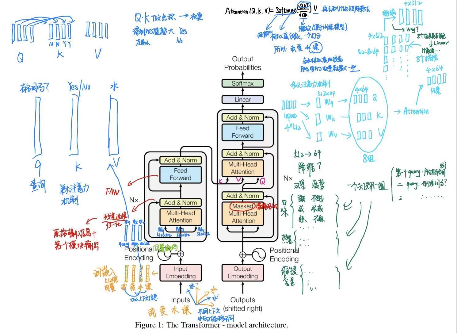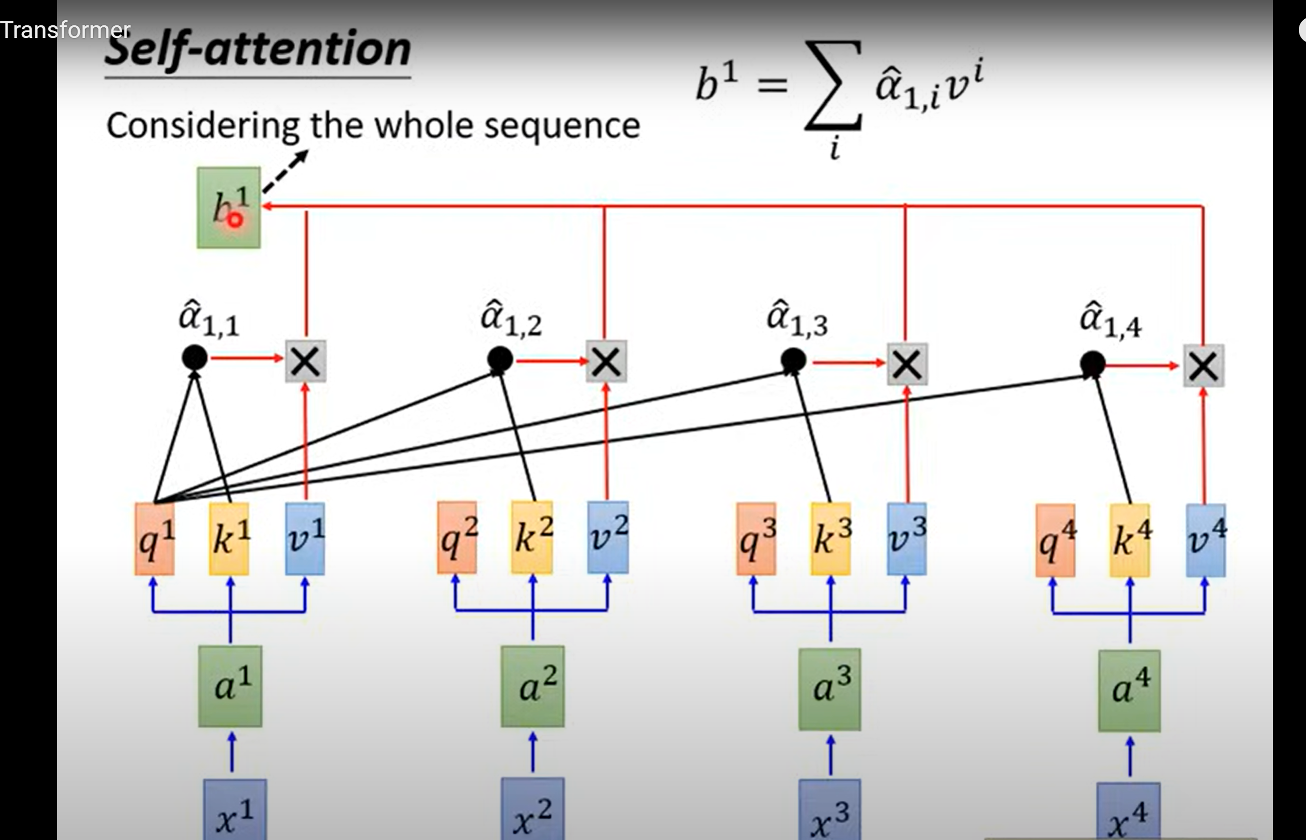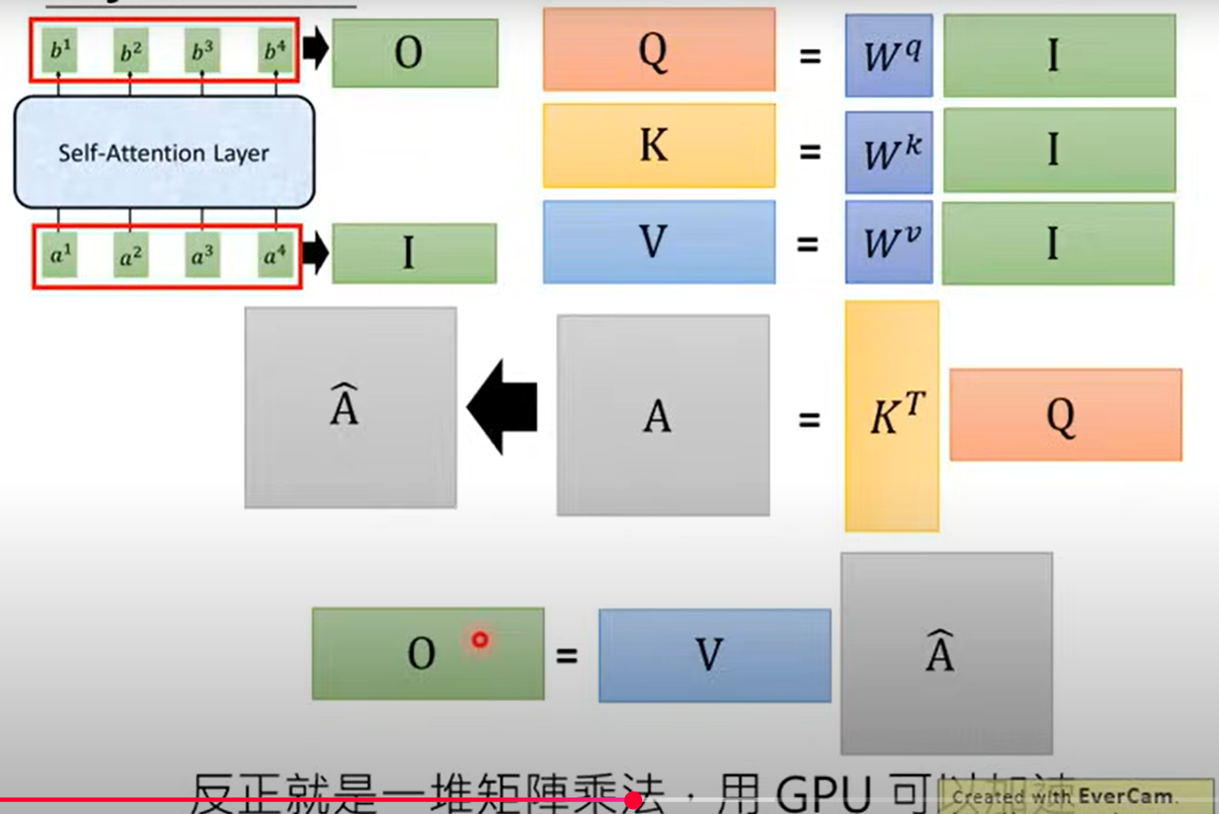 - 首先是一个词的原始向量分别乘以对应的权重矩阵得到自己的Q、K、V,然后整个squence的q矩阵去点积K矩阵,经过Softmax归一化后得到一个矩阵就是A,这个A相当于是每个词之间的联系的强弱,接着去和V矩阵做矩阵乘法得到B矩阵,所以说现在b1、b2、b3...可以平行地被算出来