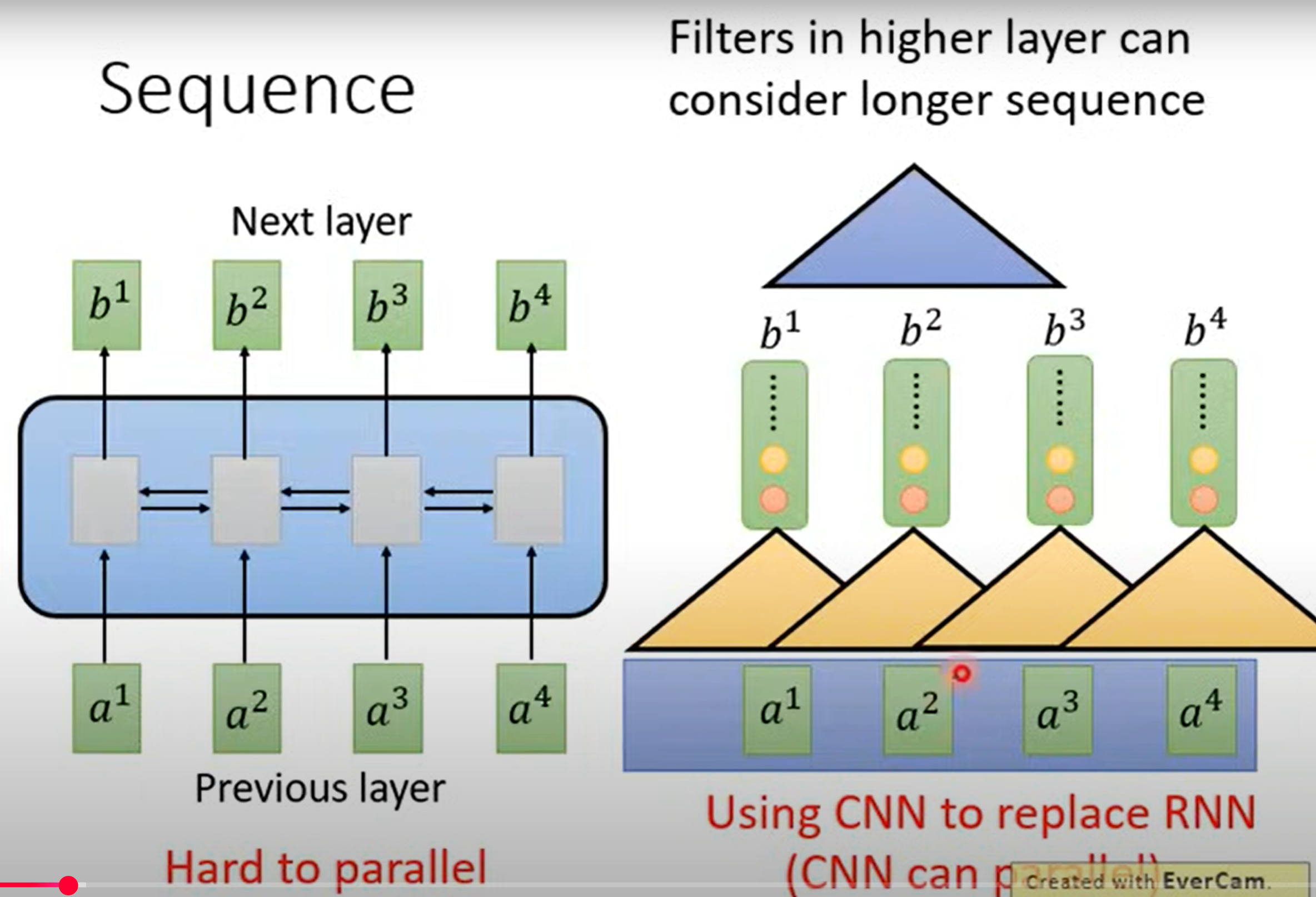 - 用CNN来代替RNN,CNN是可以实现平行化的,因为我不需要b1算完,我就可以计算b2,只要我堆叠足够的卷积核,就可以捕捉到整个序列的信息,但是缺点是我需要叠很多层😭
